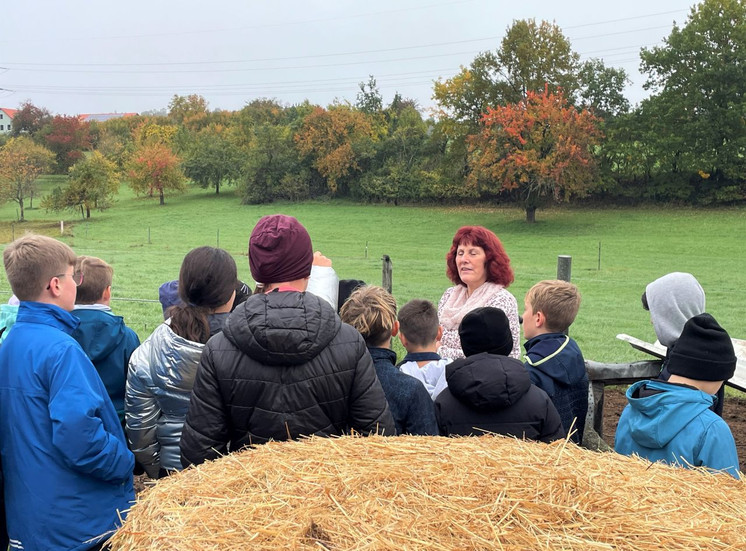 Im Rahmen des Projekttages „Nachhaltigkeit und Gesundheit“ machte sich die Klasse V5A am 16. Oktober zu Fuß auf den Weg zum Stürmerhof nach Oberbaimbach. Nach einer guten Stunde bei nebligem Oktoberwetter erreichte die Klasse mit ihren Lehrkräften Nadine Leonhardt, Andrea Götz und Mathias Schleicher das Ziel, wo Frau Stürmer bereits die Schülerinnen und Schüler erwartete.